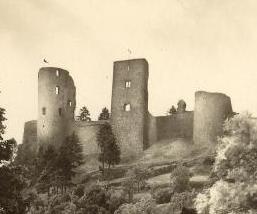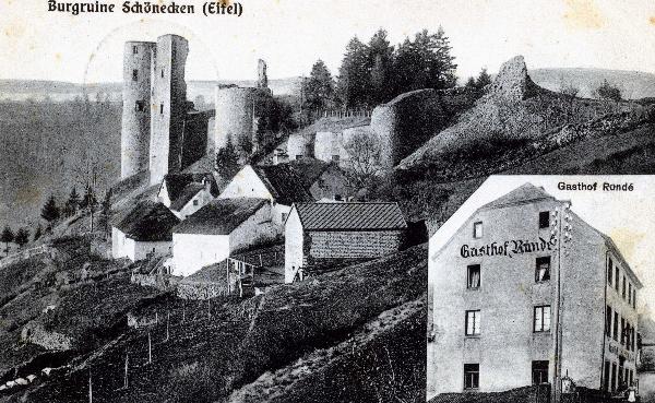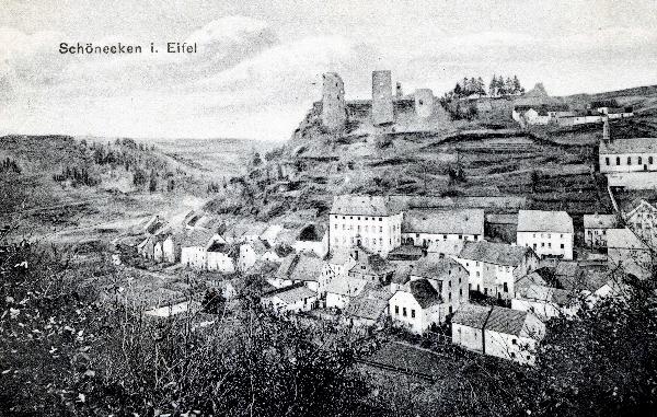 Diese sensationelle Fotografie entstand zwischen 1880 und 1890. Der Fotograf kam aus Speicher, die Aufnahme stammt von einer alten Fotoglasplatte. Es erstaunt ganz besonders an der Burg Ruinenteile zu erkennen, die fast kein jetzt Lebender mehr kennt. Im hinteren Bereich der Burg sind Reste eines weiteren Turmes zu erkennen, im vorderen rechten Bereich ist der Turmansatz auch deutlich höher als gegenwärtig. Im Vordergrund befindet sich linkerhand das heutige Haus Bastuck, rechts davon wahrscheinlich eine ehemalige Gerberei. Es handelt sich um die älteste Fotografie die uns aus Schönecken bekannt ist! | ||||