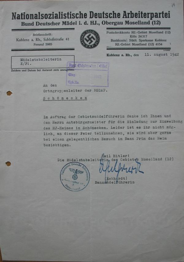 Historische Dokumente: 1) Absage der Teilnahme des BDM Obergau Moselland vom 11.08.1942, zur Einweihung des HJ-Heimes am 16.08.1942 in Schönecken. |