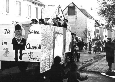 Schon die Fastnacht 1953 wurde durch das Thema "Zusammenlegung" geprägt. Links im Bild: Fastnachtslied des Zalditschens zur