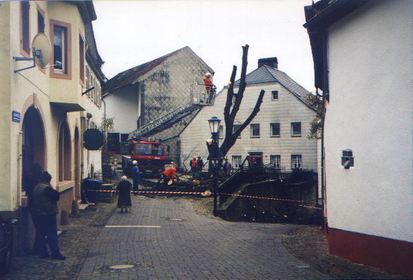 Darum blieb der Gemeinde keine andere Möglichkeit, als die Fällung zu beordern.Feuerwehr und Bauhof nahmen sich dieser nicht ganz einfachen Aufgabe unter