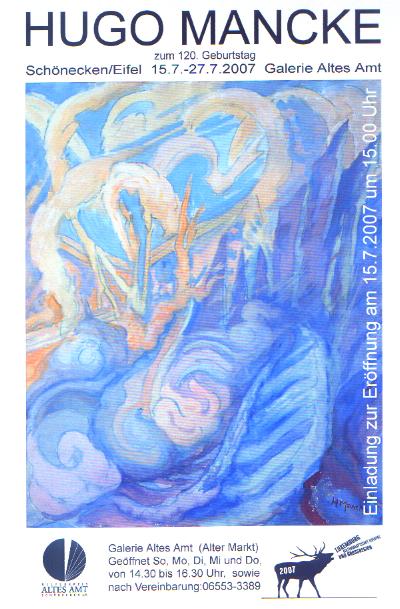 bunten Lagern der Zigeuner. Die folgenden Arbeiten sind charakteristisch eigentlich für die ganze Düsseldorfer Zeit. Die zarten tonigen Stimmungen des Niederrheins bilden ein Hauptthema für diese realistische Epoche. Pappeln und Weiden im Frühnebel, Glanzlichter auf dem Strom - in unendlich vielen Variationen wurde Hugo Mancke nie müde, in verhaltenen Farben seine Heimat zu schildern. Fast alle Bilder dieser Lebenzeit, einschließlich der Motive aus dem Bergischen Land, verbrannten im zweiten Weltkrieg. Dann, zu Beginn der fünfziger Jahre, tritt der Realismus zurück. Ist die Düsseldorfer Epoche charakterisiert durch die Arbeit nach der Natur, so sind die folgenden Malereien mehr Atelierbilder. Bilder, die aus der Erinnerung gemalt wurden und die mehr ideellen Charakter tragen, Bilder, in denen die Landschaft nicht mehr um ihrer selbst willen gemalt wird. Das Bild der Landschaft wird zur Aussage, die über die bloße Erscheinungsform hinausgeht. Im Weiteren sehen wir das Landschaftsmotiv sich abermals wandeln. Nebelschwaden werden zu Gestalten, der Wasserfall belebt sich, um die Frühlingsblüten webt ein Geisterreigen. Zwar waren Wesen der elementaren Welt schon früher in den Zwergenbildern vorgekommen, aber mehr in traditioneller Weise, nun wachsen die Gestalten frei aus der Umgebung, aus den Formgebärden der Natur selbst heraus. Aber der Verwandlungsprozeß der Landschaft geht weiter: Für Hugo Mancke verwandelt sich die äußere Landschaft in eine innere. Aus der Naturlandschaft wird eine Seelenlandschaft, aus dem Naturbild ein Seelenbild. Dem inneren Aspekt entsprechend verwandeln sich die Farben. Ist die Düsseldorfer Palette bestimmt durch dezente Grautönungen, so steigert sich die Farbintensität ständig bis hin zu einer neuen Gruppe von Arbeiten des 80 Jährigen, bei der die Farben und Formen nicht mehr einer aus der Gegenstandswelt entliehenen Bildmotivation, wenn auch ins Seelische übertragen, dienen, sondern sich ohne eine solche ihren freien Ausdruck schaffen. Wir können also vier Verwandlungsstufen des ursprünglichen Landschaftsbildes beobachten: die realistische Landschaft wird zu ideellen. Die ideelle Landschaft wird zur wesensdurchworbenen Landschaft. Diese verwandelt sich in Seelenlandschaft und Seelenbild. Endlich sprechen sich Form und Farbe selbst aus. Im Zusammenhang mit diesen Stufen stehen Arbeiten, die aus der Auseinandersetzung mit der Zeitsituation entstanden sind, aber auch solche, deren Motive buddhistischer oder christlicher ikonographie entstammen und um deren Bildinhalte gerungen wird. Einen verhältnismäßig breiten Raum nehmen die stillebenartigen Blumenbilder ein. An ihnen wird wie fabulierend die ganze Empfindungsskala der Farben frei. Sprachen wir eingangs von einer einheitlichen Lebenskomposition, so nicht im Sinne eines logischen Programms. Das Leben selbst in seinem inneren Ablauf macht im Bilde Lebensstufen sichtbar. Hugo Mancke hat nie im Sinne eines äußeren Zieles gearbeitet, hat sich auch nicht um die jeweiligen Kunstmeinungen gekümmert. In aller Stille ging er seinen Weg. Aus Ehrfurcht in der Begegnung mit der Natur und Leben fand er im künstlerischen Empfinden un Tun seinen Weg der Verinnerlichung, den Weg von der Natur zum Menscheninnern. Günther Mancke |