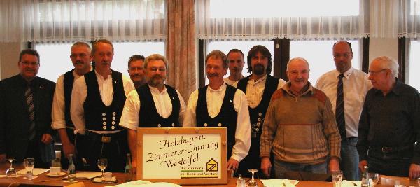 Obermeister Peter Floss hofft auf mehr Ausbildungsplätze zur Sicherung des Fachkräftebedarfs. Der in der Jahreshauptversammlung der Holzbau- und Zimmerer-Innung Westeifel einstimmig wiedergewählte Obermeister aus Schönecken ruft seine Kollegen nachdrücklich auf, mehr Ausbildungsplätze zu schaffen. Sein Betrieb wird auch in diesem Jahr wieder mindestens einen jungen Menschen zum Zimmerer ausbilden. Insgesamt herrsche in der Region aber ein Mangel an Ausbildungsplätzen. Die 20 Mitgliedsbetriebe haben zurzeit 18 Lehrlinge in drei Lehrjahren. "Wir wissen, dass es vor allem für Kleinstbetriebe schwer ist auszubilden, bitte geht aber noch mal in Euch und gebt motiviertem und engagiertem Nachwuchs die Chance unser Handwerk weiter zu tragen", appellierte Floss an seine Kollegen. In diesem Zusammenhang dankte der Obermeister auch dem langjährigen Vorsitzenden des Prüfungsausschusses Matthias Klasen für seinen engagierten Einsatz. Klasen, der sein Amt als Lehrlingswart der Innung abgab, will auch intern den Nachwuchs für weitere Aufgaben vorbereiten. Hier setzte die Innung ein erstes Zeichen und wählte Mike Guntermann einstimmig zum neuen Lehrlingswart. |