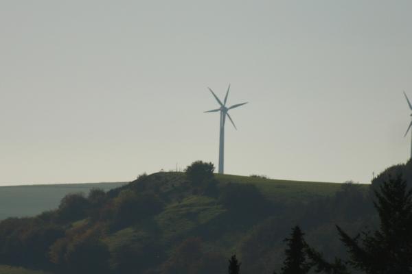 Selten gesehen: Eine sechsblättrige Windmühle - ein echter Kraftprotz, leider aber nur eine optische Täuschung. Es sind zwei hintereinander stehende Windmühlen bei Winringen. Das Bild wurde vom Bellert aus aufgenommen. |