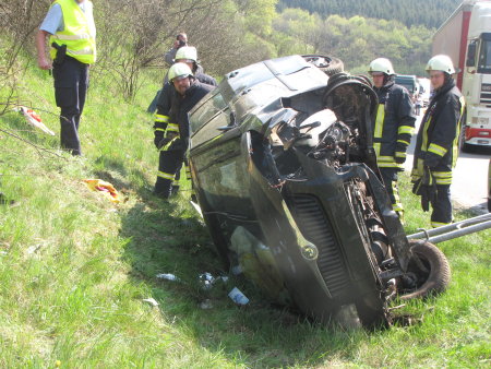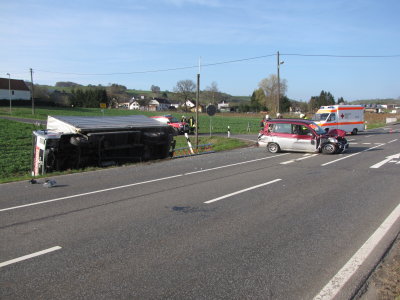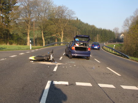 Leichtverletzten Ein folgenschwerer Verkehrsunfall ereignete sich am Freitag, dem 8. April, gegen 16.30 Uhr, auf der B 51 zwischen den Anschlußstellen Brühlborn und Olzheim, als in dem dort eingerichteten Baustellenbereich ein in Richtung Köln fahrender Pkw-Fahrer trotz Überholverbots auf dem beidseitig einspurigen Streckenabschnitt einen Lkw überholen wollte. Um einen Frontalzusammenstoß zu verhindern, wich ein entgegenkommender Geländewagen-Fahrer geistesgegenwärtig nach rechts aus und überfuhr eine Baustellen-Bake. Der nachfolgende Pkw konnte nicht mehr rechtzeitig ausweichen und prallte gegen das Heck des Geländewagen, wodurch sich an dem Pkw die konkrete Gefahr eines Motorbrandes entwickelte, welche durch sofortige Löschmaßnahmen eines Beteiligten glücklicher Weise frühzeitig gebannt werden konnte. Durch den Auffahrunfall wurden insgesamt 4 Fzg-Insassen in den zwei Fahrzeugen leicht verletzt. Sie konnten nach ambulanter Versorgung im Krankenhaus Prüm wieder entlassen werden. Es entstand Sachschaden von ca. 15.000 Euro. Im Einsatz waren die Polizei, Feuerwehr und das DRK Prüm. |