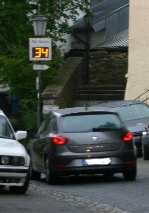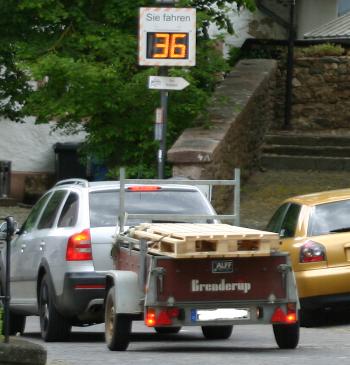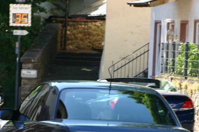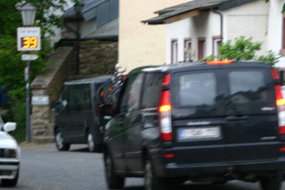 10.50 Uhr Messung I: 106 Kraftfahrzeuge, davon 96 PKW, 6 Kleinbusse/ Pritschenwagen, 4 Krafträder, 8 Fußgänger und 1 Radfahrer. 12 Raser. Ortsfremde Kennzeichen: BN, BM, DN, K, OD, RP, TR, sowie die Länderkennzeichen NL und PL. |