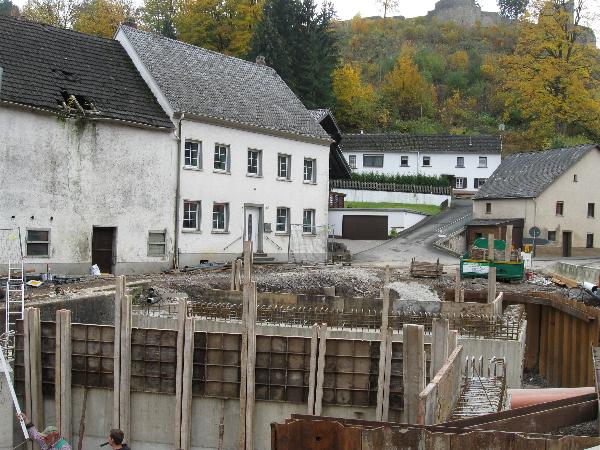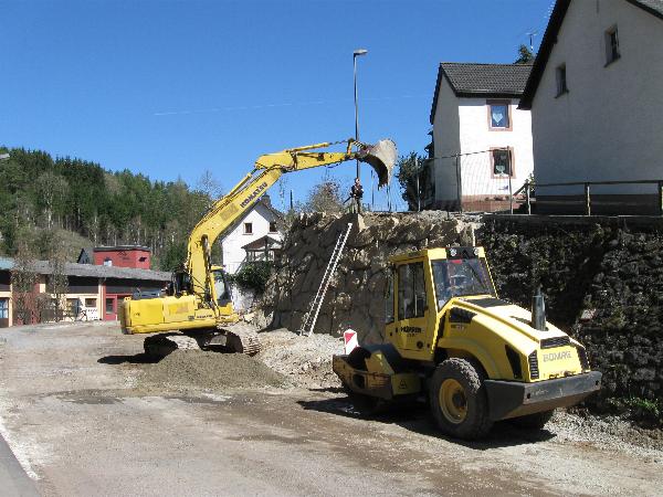Wo vorher die Häuser "Wiebus" (ehemals Esch) und "Melchisedech" standen, wird jetzt eine mächtige Natursteinmauer errichtet. | ||