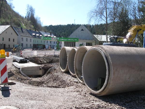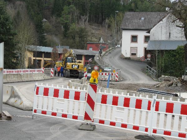Foto vom 27.03.2016: Die letzte Phase des innerörtlichen Ausbaus der L5 hat begonnen. Heute (01.04.2016) wurde, ab der Brücke/Behelfsbrücke, die alte Fahrbahndecke Richtung Ortsausgang Prüm von der Fa. Köppen entfernt. | ||