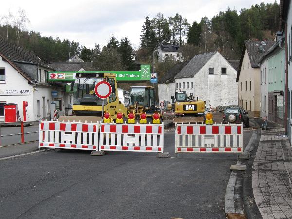 Foto vom 17.02.2016: Die Straße ist immer noch durchgängig befahrbar. Vermutlich werden die Bauarbeiten jetzt erst im März fortgesetzt. Die neue RWZ-Tankstelle nimmt bereits Gestalt an. Seit einigen Tagen kann man dort wieder mit EC- oder Raiffeisen Transponderkarte an zwei der vier Zapfsäulen tanken. Die Neueröffnung der Tankstelle findet am 17.04.2016 während der "Nimstalschau" statt. | ||