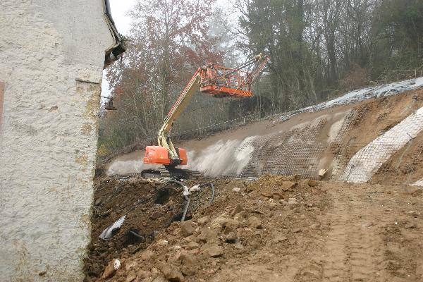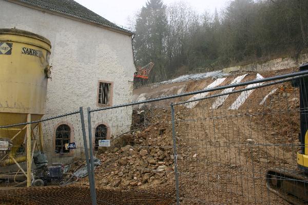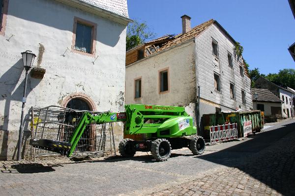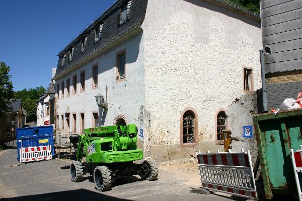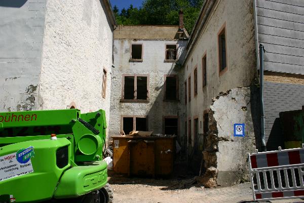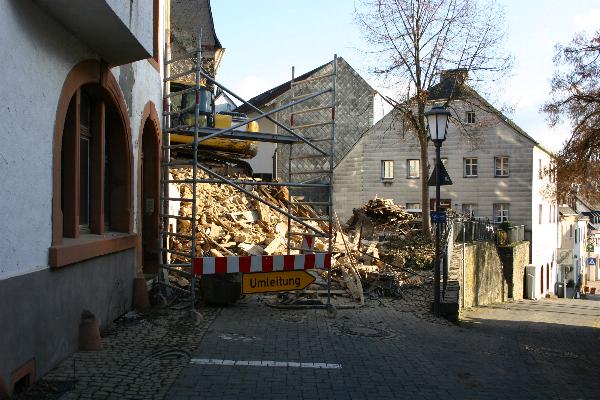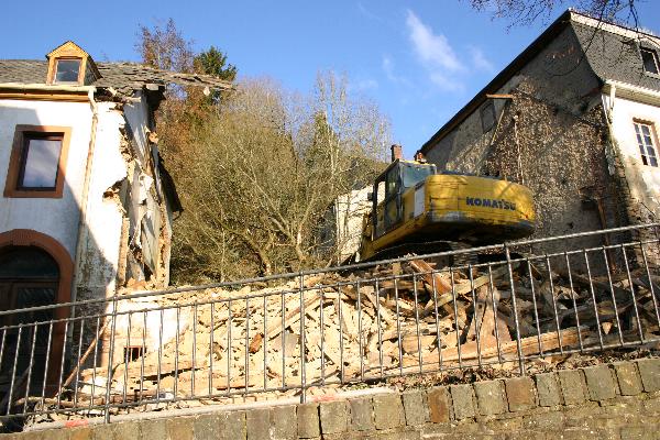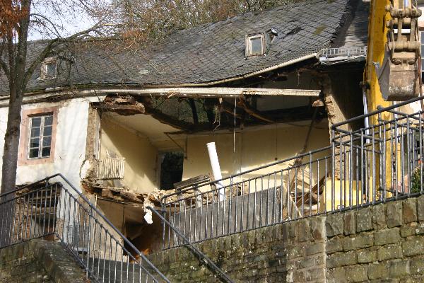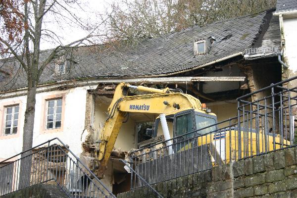 Fotos unten vom 12. Dezember 2018: Der Teilabriss hat begonnen. Firma Thomas Blum ist der Abbruchunternehmer für das untere Gebäude. Der Abriss der rückwärtigen Gebäudeteile und die Sicherung des Hangs wurde Ende Juni 2019 von einer Firma aus dem Kreis Düren begonnen. Für die Folgenutzung des verbleibenden Hauptgebäudes wird noch ein Investor gesucht. |