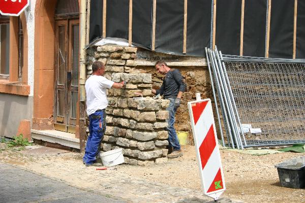 Bild oben: Die Gemeindearbeiter sichern die Türeinfassung und den Sturz vor dem Gebäudeabriss. |