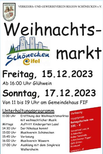 Der diesjährige Weihnachtsmarkt war, wie schon in den Jahren zuvor, ein echter Publikumsrenner mit sehr vielen Besuchern. Die Fotos sprechen für sich selbst! Begleitet wurde die Veranstaltung mit weihnachtlicher Musik durch den MV Schönecken.. |
