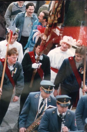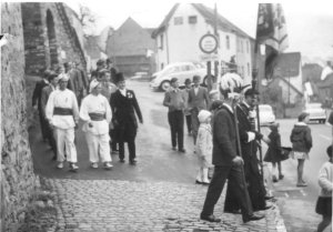 Sodalität noch einmal mit Musikbegleitung durch den alten Ortskern. Der Wettkampf beginnt
