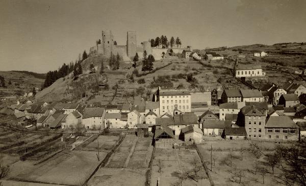 Alte Aufnahme vom fast unbewachsenen Burgberg und Von-Hersel-Str./Unter der Pfordt, Jahr unbekannt. Mit im Bild: linkerhand der Schule die Schmiede Kruft, gegenüber ein altes Fachwerkhaus und rechterhand der Schule der alte Spritzenturm. |