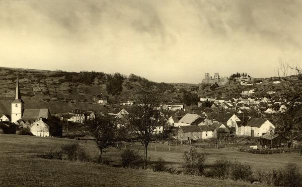 Im Bild links steht die alte Pfarrkriche noch allein, die Aufnahme stammt aus den frühen fünziger Jahren.
