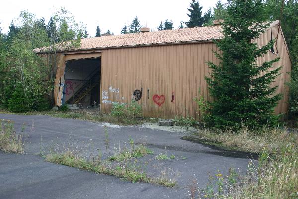 | Auch die Graffitis zeugen von nachmilitärischer Nutzung des Geländes. Die Halle im Bild ist mittlerweile eingestürzt. |
