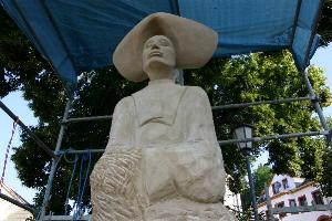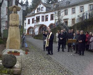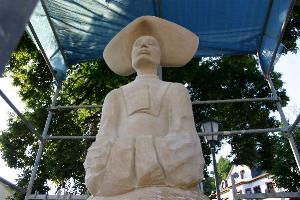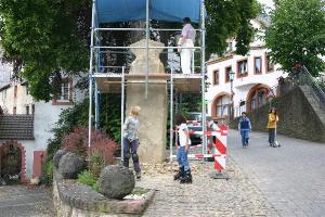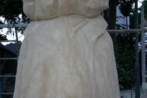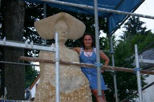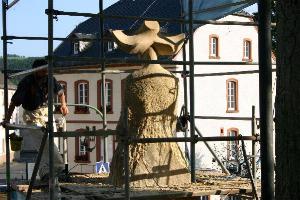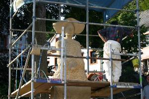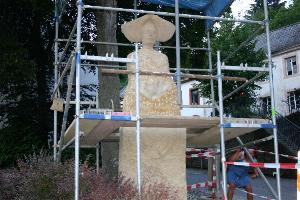 Während des Kapellenfestes erhält Herr Thimmel Hilfe von begeisterten Kindern die sich hier mit Hammer und Meißel am Vinzentinerinnendenkmal unter künstlerischer Anleitung versuchen. |